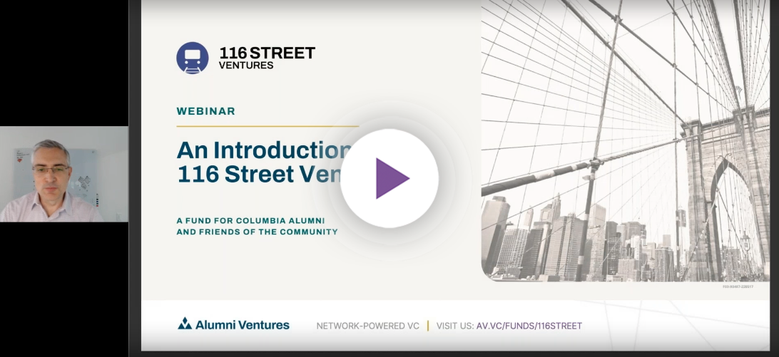 Watch our on-demand, 40-minute presentation about 116 Street Ventures, Alumni Ventures’ fund for Columbia alumni and friends of the community.